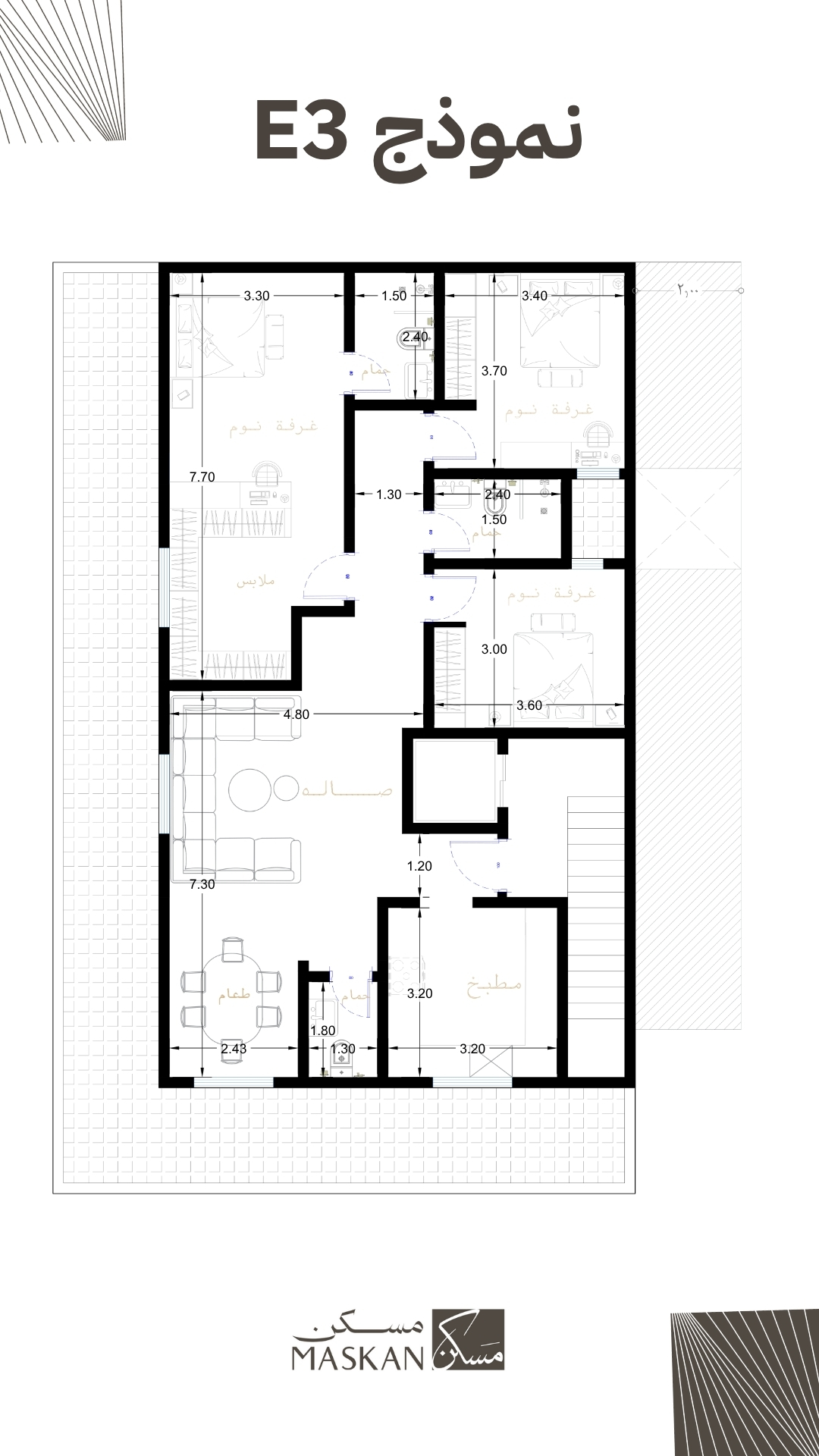 م نموذج E3 تجربة سكنية متكاملة تجمع بين الرحابة، الخصوصية، وحسن توزيع المساحات.
